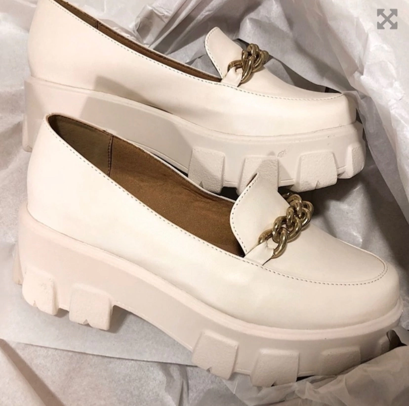 MODELO: mocassim tratorado off-white com corrente dourada.